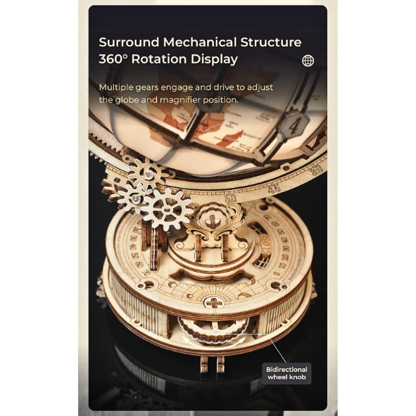 The gear-driven rotation mechanism enables the globe's spinning movement.