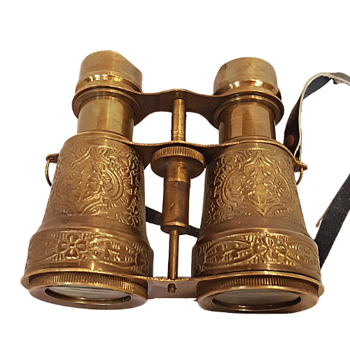 With intricate scroll work covering these unusual brass binoculars, made in the Royal Navy style of 1857 with 10x10 magnification. 10 cm tall x 12 cm wide. Extended 12 cm tall. With a fitted leather strap to carry around the neck while out looking at nature. We think these binoculars defiantly have a Steampunk vibe to them.