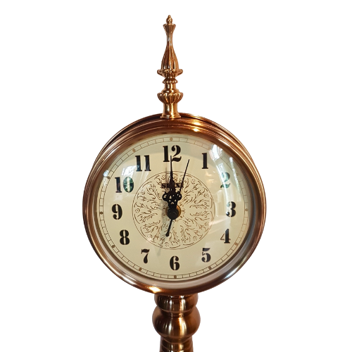 On an art decor style layered stand of gold and black blocks, sits this lovely gold metal clock with a Shixi movement and glass cover. Clear numbers around the clock face in black and gold edging with a feathered design in the center.